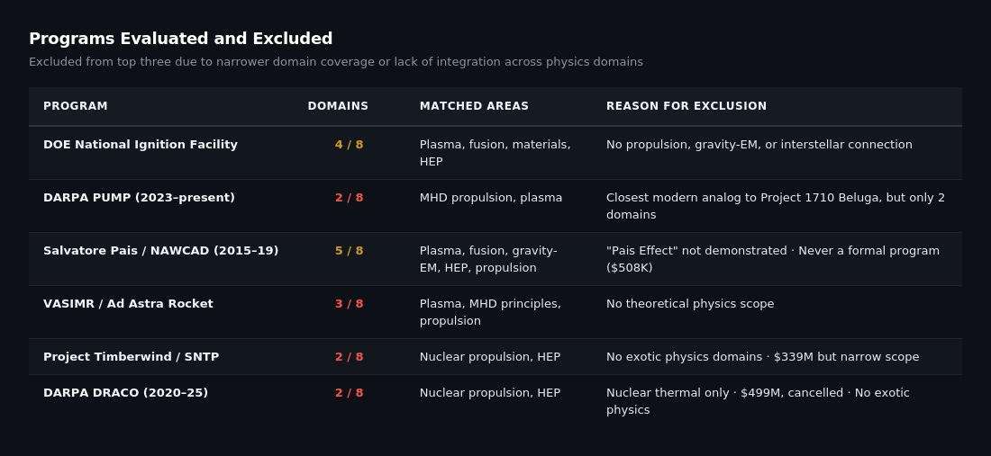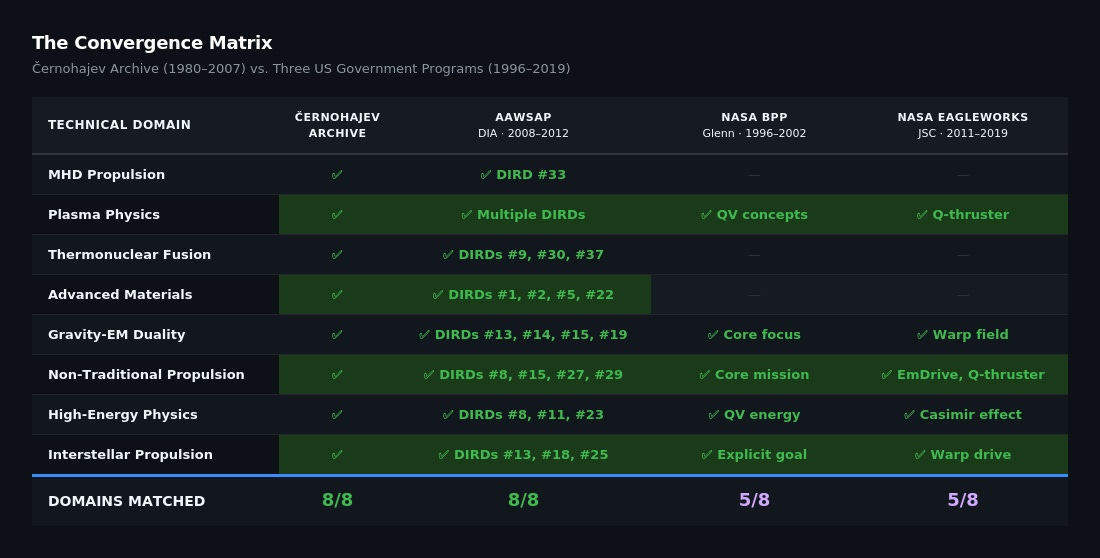 Lo que demuestra: El Archivo Černohajev y estos tres programas estadounidenses investigaron los mismos ocho dominios técnicos. La alineación es verificable empíricamente. Todos los DIRD están disponibles públicamente. El Archivo está documentado. Las conexiones del personal son de dominio público.
