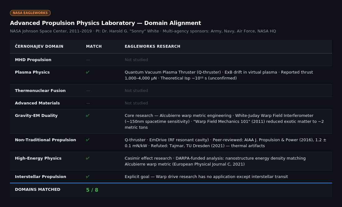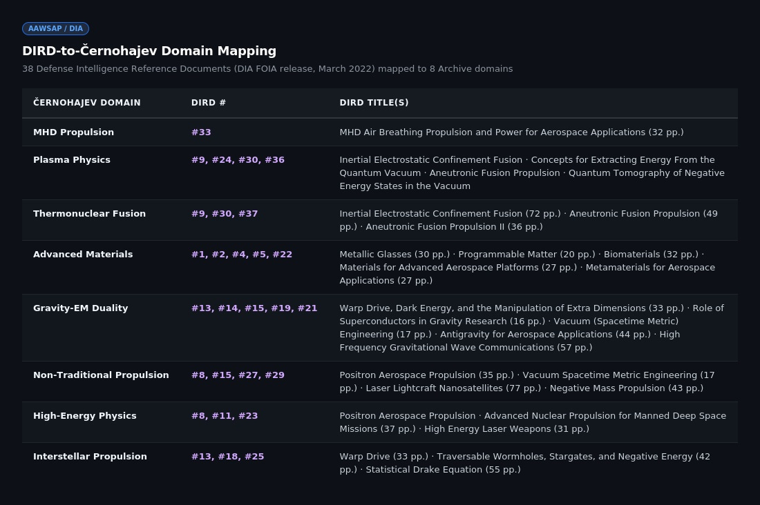 La alineación no es meramente temática. La lógica de puesta en servicio del programa DIRD, para evaluar la tecnología avanzada en relación con las observaciones aeroespaciales anómalas, refleja el principio organizativo del Archivo Černohajev: especificaciones de ingeniería derivadas del análisis de las características anómalas de las naves. Ambas colecciones tratan la propulsión MHD, la energía de fusión, los materiales avanzados, la modificación de la gravedad y la capacidad interestelar no como curiosidades independientes, sino como componentes de un único sistema aeroespacial integrado.