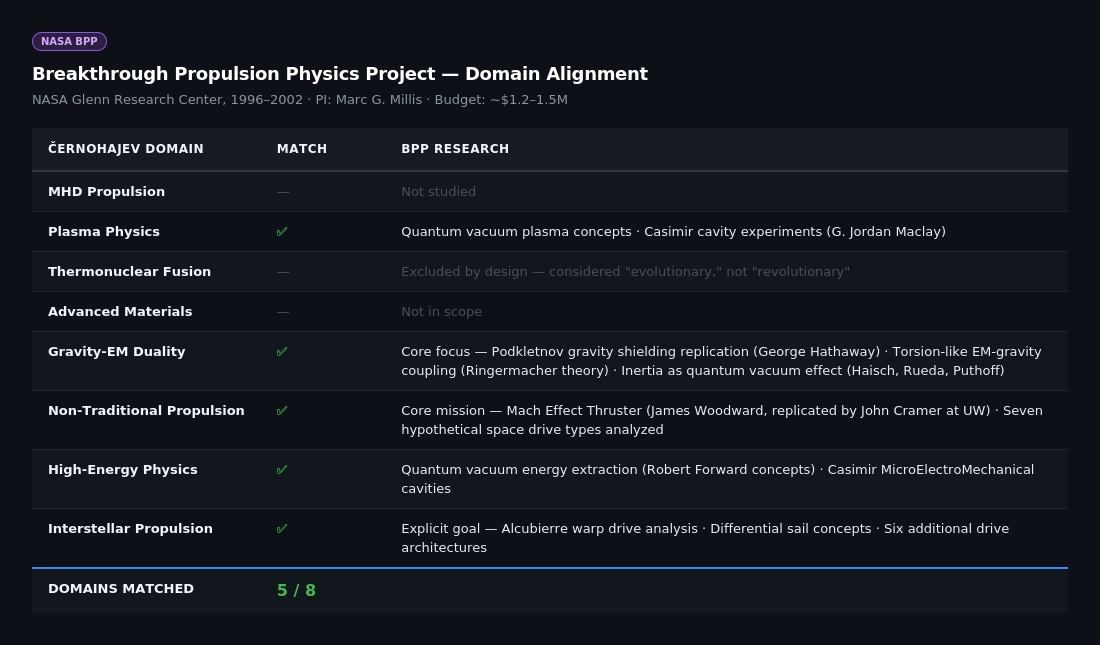 Dominio 6 — Propulsión no tradicional. Los manuscritos se alinean directamente con el programa soviético Thread-3 (1986-1991), cuyo mandato abordaba los motores no tradicionales y su interacción con el entorno. Los documentos de Černohajev hacen referencia a unidades militares específicas (67947, 73790) e instituciones de investigación (IZMIRAN, Instituto Kurchátov) que aparecen en la documentación desclasificada de Thread-3.