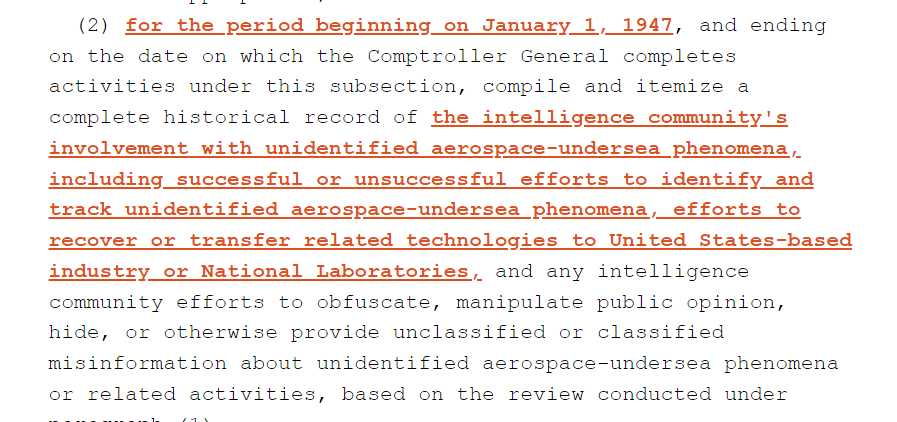 (2) para el período que comienza el 1 de enero de 1947 y termina en la fecha en que el Contralor General complete las actividades bajo esta subsección, compilar y detallar un registro histórico completo de la participación de la comunidad de inteligencia con los fenómenos aeroespaciales-submarinos no identificados, incluyendo esfuerzos exitosos o no exitosos para identificar y rastrear fenómenos aeroespaciales-submarinos no identificados, esfuerzos para recuperar o transferir tecnologías relacionadas a la industria o Laboratorios Nacionales de Estados Unidos, y cualquier esfuerzo de la comunidad inteligencia para ofuscar, manipular la opinión pública, ocultar, o de otro modo proporcionar información no clasificada o clasificada errónea sobre fenómenos aeroespaciales-submarinos no identificados o actividades relacionadas, con base en la revisión realizada bajo párrafo 1).