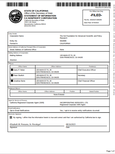 Sin embargo, mi propia investigación adicional localizó detalles de otra Fundación The Sol, esta vez en California. Según los registros de nombres comerciales de la Secretaría de Estado de California, la Fundación Sol para la Investigación Científica y Política Avanzada reservó ese nombre el 28 de junio de 2023 y luego registró ese nombre el 7 de julio de 2023. Número de entidad 5810665. El nombre de su agente era Incorporating Services Ltd. Sus funcionarios figuran como Garry P. Nolan, director ejecutivo; Secretario Peter Skafish; y Jonathan Berte, director financiero. El artículo II de sus estatutos incluye el texto "El propósito específico y principal... que incluye, entre otros, apoyar la investigación y la comprensión de fenómenos anómalos no identificados".