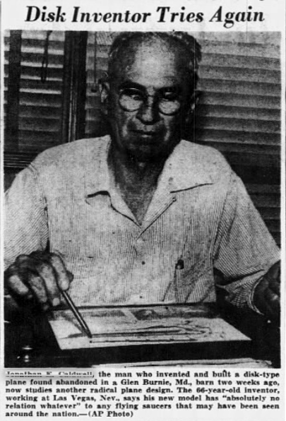 Jonathan E. Caldwell, el inventor "desaparecido", acababa de mudarse de Maryland a Nevada. Todavía estaba desarrollando aviones, pero dijo que ninguna de sus máquinas tenía nada que ver con los platillos voladores.