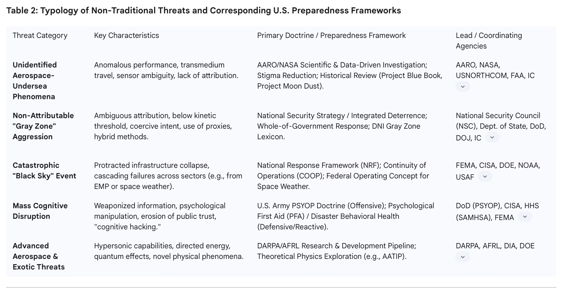 Este informe ofrece un análisis exhaustivo de la preparación, la planificación de contingencias y la doctrina del gobierno estadounidense para este espectro de amenazas de baja probabilidad y alto impacto. Va más allá de una investigación limitada de un fenómeno aislado para realizar un examen holístico de la postura estratégica del país ante eventos que desafían los marcos de respuesta convencionales. El análisis disecciona las dimensiones estratégicas, legales, operativas y cognitivas de este nuevo desafío de preparación, basándose exclusivamente en material gubernamental y de expertos de prestigio. Mapea el panorama actual de doctrina, autoridades legales y mecanismos de coordinación interinstitucional, sintetizando información diversa para revelar conexiones, solapamientos y posibles deficiencias en la preparación nacional.