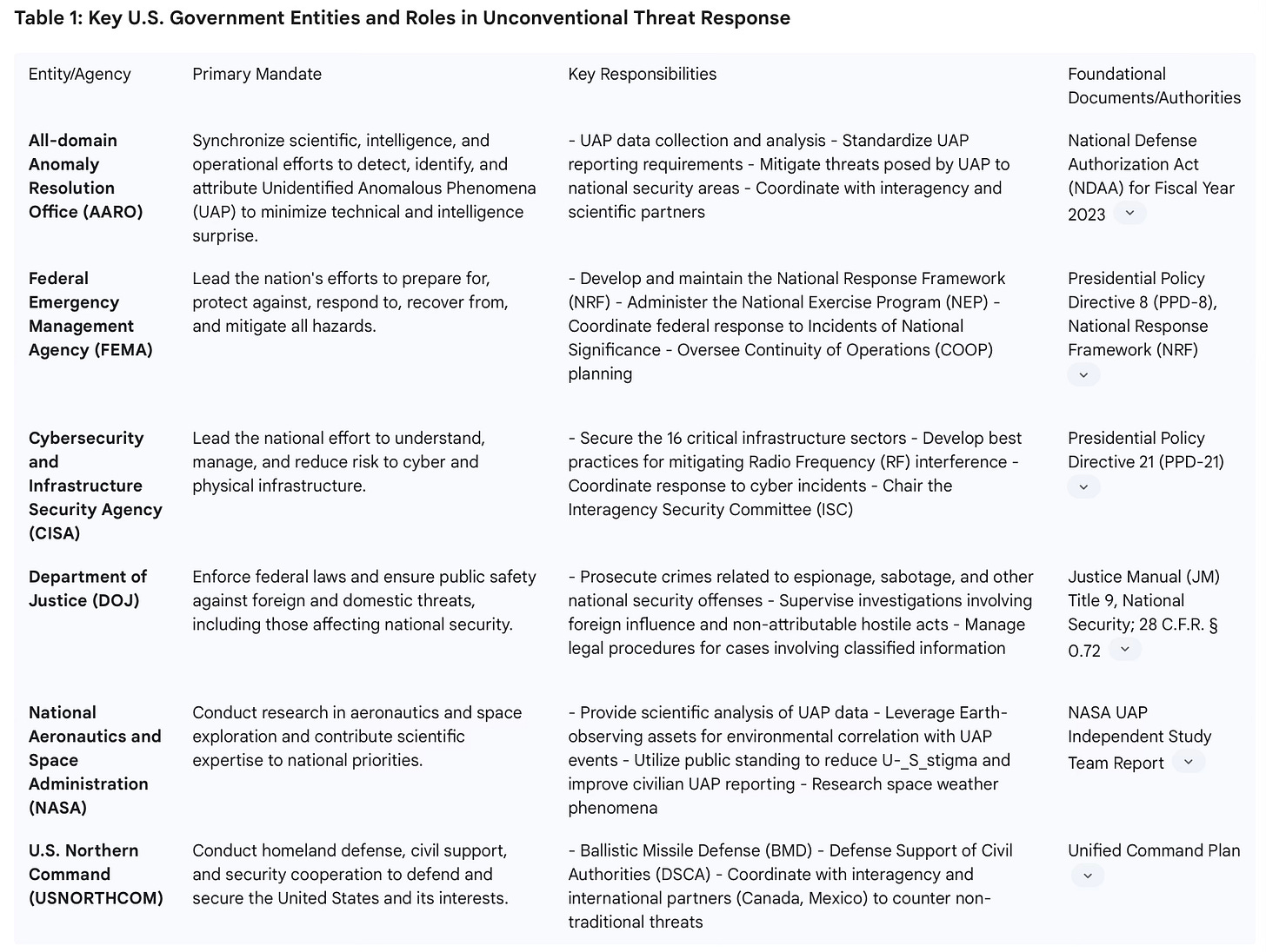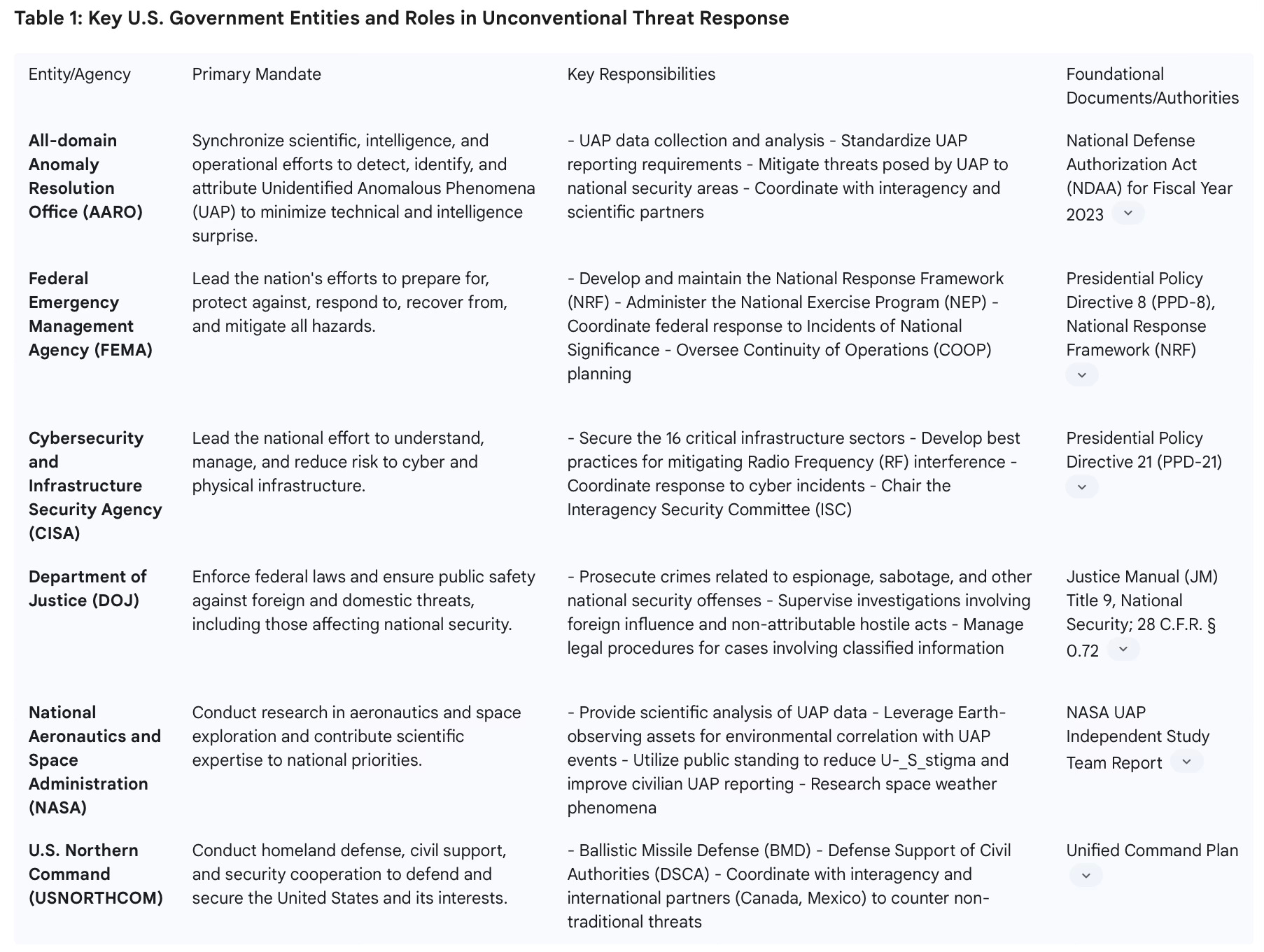 El alcance de esta investigación abarca una gama de amenazas no convencionales, desde los peligros tangibles de los eventos de "cielo negro" y la interferencia electromagnética hasta los desafíos más ocultos que plantean los fenómenos anómalos no identificados (FANI), los vehículos transmedia y los efectos de campo exóticos. Fundamentalmente, también examina las amenazas intangibles pero potentes de la disrupción cognitiva y la respuesta psicológica masiva a las crisis nacionales. Para comprender el complejo ecosistema de entidades gubernamentales involucradas en estos esfuerzos, la Tabla 1 proporciona una guía básica sobre las organizaciones clave y sus respectivas funciones en la preparación y respuesta ante las amenazas no convencionales que se detallan en este informe.