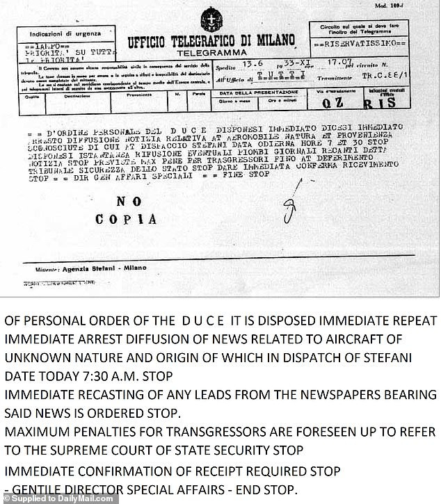 Incluyen dos telegramas de junio de 1933 en italiano, uno de los cuales exigía "silencio absoluto" sobre un "supuesto aterrizaje en suelo nacional de una aeronave desconocida".Otro, fechado el 13 de junio, amenaza con "arresto inmediato" y "penas máximas" para cualquier periodista que informe sobre una "aeronave de naturaleza y origen desconocidos"."Se ordena la reedición inmediata de cualquier noticia de los periódicos que contengan dicha noticia", decía el segundo telegrama.Ambos dicen que lo hacen por «orden personal» de «Il Duce», es decir, del propio Mussolini.17