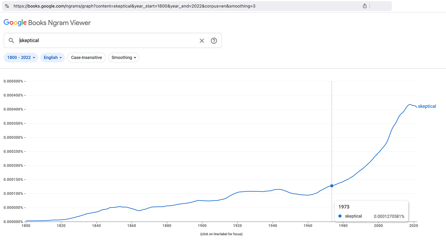 Visor de libros de Google Ngram sobre el crecimiento del uso del término «escéptico» |