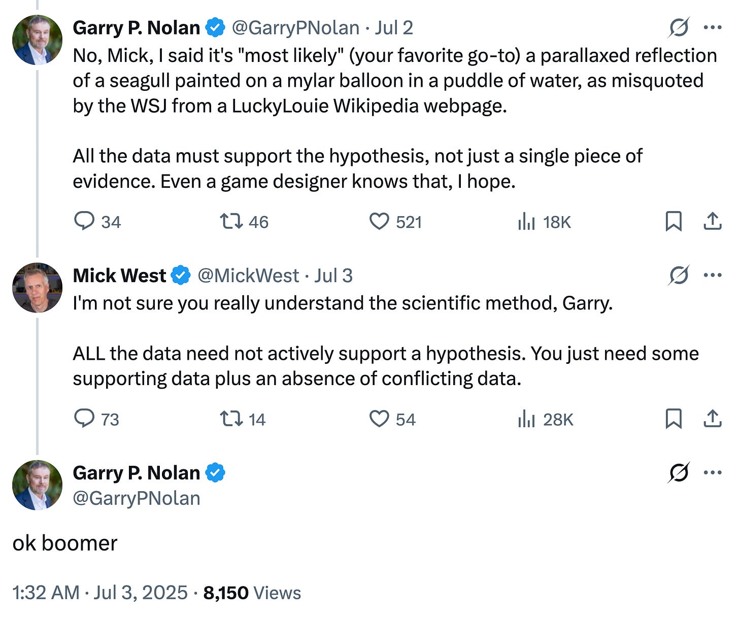 Consideremos de nuevo a Mick West. Su contribución a la investigación científica es prácticamente nula. En lugar de promover la investigación, critica las investigaciones de los científicos en activo. Tomemos como ejemplo a Garry Nolan, quien continúa dirigiendo laboratorios exitosos, experimentando, produciendo trabajos revisados por pares, solicitando patentes, obteniendo citas y basándose en el método científico para su sustento. De alguna manera, Nolan —una figura científica influyente en la investigación exitosa— no recibe elogios de West, sino que es el blanco de sus críticas, como en este intercambio literal de julio de 2025: