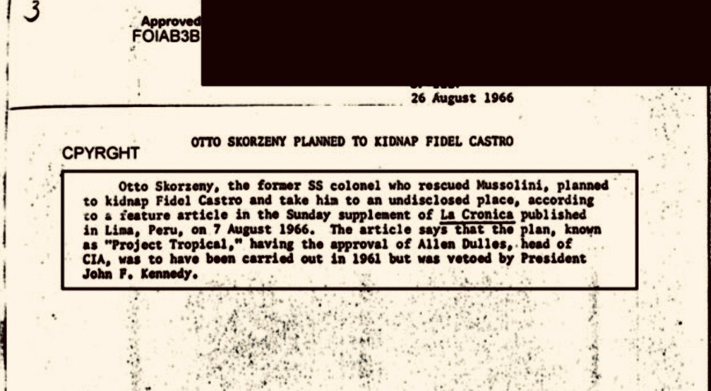 En mi artículo anterior, La conexión nazi oculta con la muerte de John F. Kennedy, menciono un documento desclasificado disponible en el sitio web de la CIA que resume una noticia de Perú. El documento afirma: “Otto Skorzeny, el ex coronel de las SS que rescató a Mussolini, planeó secuestrar a Fidel Castro y llevarlo a un lugar no revelado, según un artículo destacado en el suplemento dominical de La Crónica publicado en Lima, Perú, el 7 de agosto de 1966. El artículo dice que el plan, conocido como “Proyecto Tropical”, con la aprobación de Allen Dulles, jefe de la CIA, debía haberse llevado a cabo en 1961, pero fue vetado por el presidente John F. Kennedy”. Si Allen Dulles realmente estaba contactando a los equipos de Skorzeny para llevar a cabo este tipo de operaciones encubiertas después de la Segunda Guerra Mundial, es probable que el presidente Kennedy estuviera alarmado por esto y sospechara más de Dulles de lo que reconoció públicamente. Volveremos a este punto más adelante.