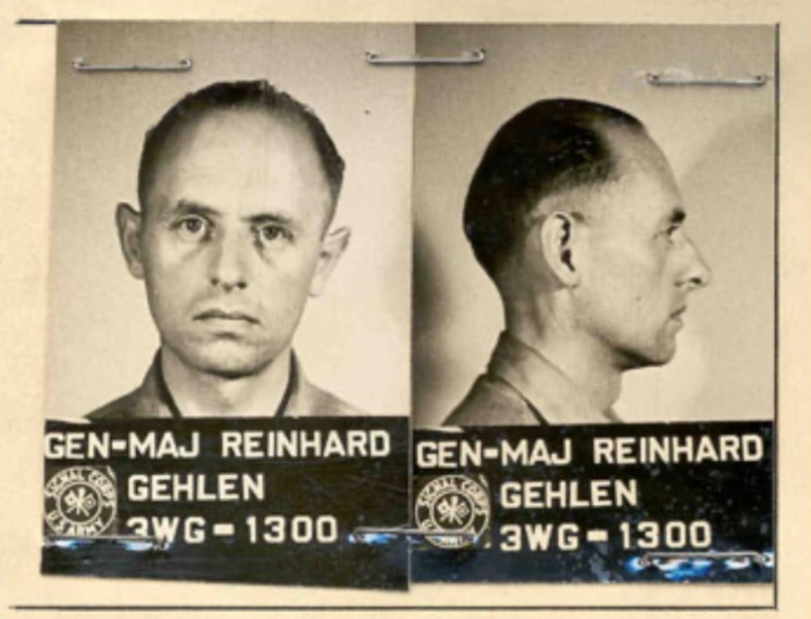 El jefe de la inteligencia de Alemania Occidental era un general nazi llamado Reinhard Gehlen. Durante la Segunda Guerra Mundial, Gehlen mantuvo una estrecha relación con el antiguo jefe de la estación de la OSS en Berna, Suiza, un prometedor oficial llamado Allen Dulles. Tras rendirse a los estadounidenses en 1945, Gehlen llegó a un acuerdo con la inteligencia estadounidense —gestionado principalmente a través de Dulles, de la OSS— para proporcionar su extensa red de inteligencia y su experiencia soviética a cambio de protección y recursos.