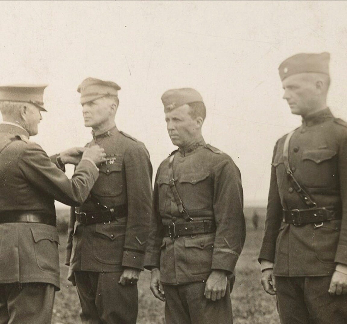 El coronel William Donovan (extrema derecha) observa al general de brigada Douglas MacArthur recibir la Cruz de Servicio Distinguido |