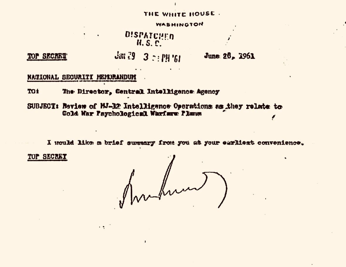 Solo he visto un documento que, en mi opinión, vincula al presidente Kennedy con los OVNIs. Este documento (en la imagen inferior) era un Memorándum de Seguridad Nacional de Alto Secreto de junio de 1961 (el mismo año del supuesto complot Castro/Skorzeny). Dirigido al Director de la CIA —quien en ese momento era Allen Dulles— con el asunto: «Revisión de las Operaciones de Inteligencia del MJ-12 en relación con los Planes de Guerra Psicológica de la Guerra Fría». Kennedy concluye: «Me gustaría recibir un breve resumen de su parte lo antes posible». [10]