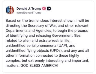 El 19 de febrero de 2026, el presidente Donald Trump ordenó al Pentágono y a otras agencias federales que comenzaran a identificar y publicar archivos gubernamentales relacionados con los OVNIs (ahora denominados formalmente fenómenos anómalos no identificados, FANI) incluyendo materiales relacionados con la “vida extraterrestre y alienígena” [1].